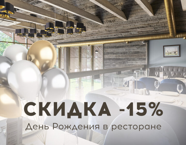 Для именинника действует единоразовая скидка 15% при заказе столика в ресторане «Мельница». Скидка действует единоразово в День рождения и 6 дней после. Акция не суммируется с другими акциями парк-отеля. Подробности акции уточняйте у администратора ресторана.