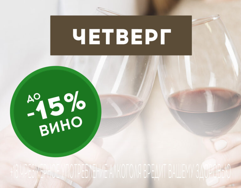 Каждый четверг в ресторане «Мельница» действует акция: скидка 10% на вино в бокале, скидка 15% на вино в бутылке.