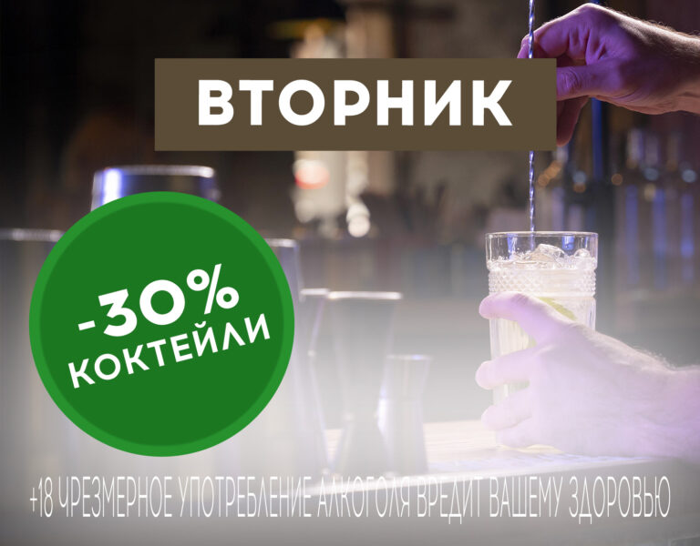 Каждый вторник в ресторане «Мельница» действует акция: скидка 30% на алкогольные коктейли.