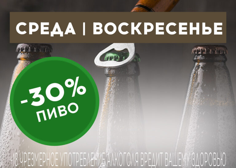В среду и воскресенье в ресторане «Мельница» действует акция: скидка 30% на фирменное пиво МиллВуд.
