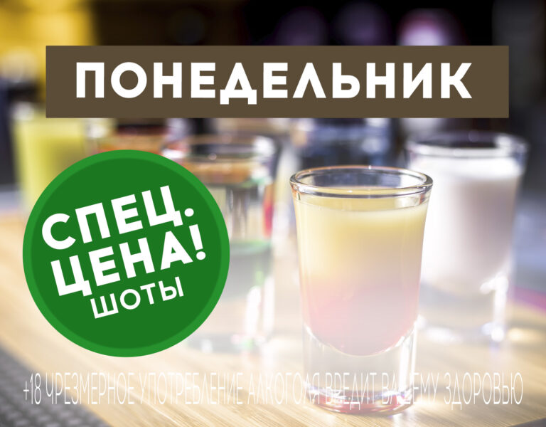 Каждый понедельник в ресторане «Мельница» действует акция: все шоты по 160 рублей, ассорти шотов — 1200 рублей.